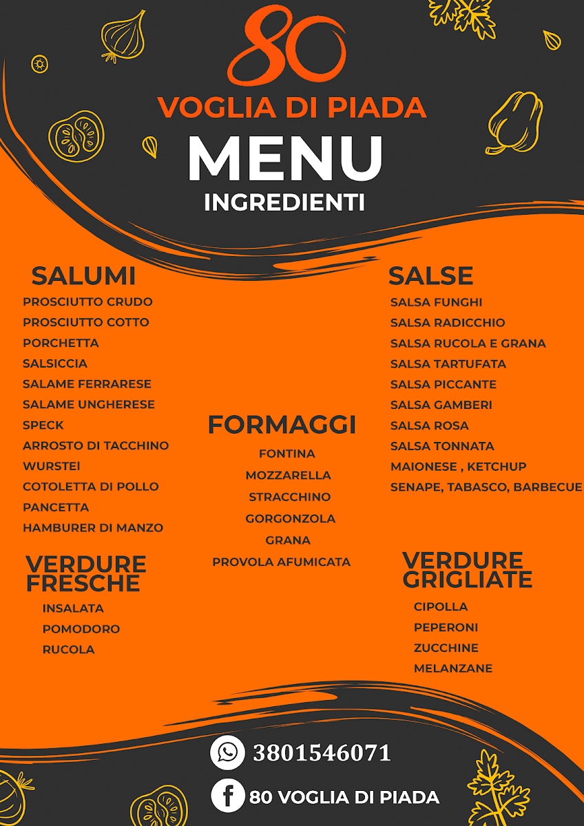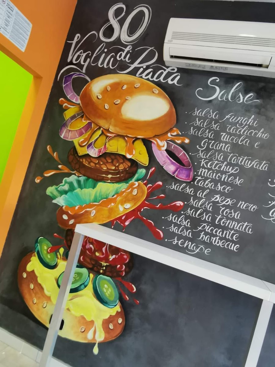 80 Voglia di Piada offers a straightforward menu centered around traditional Italian fast food with a focus on piadine—thin, soft flatbreads filled with a variety of savory ingredients. The menu reflects a casual dining experience where simplicity meets flavor, making it easy to enjoy a quick yet satisfying meal.